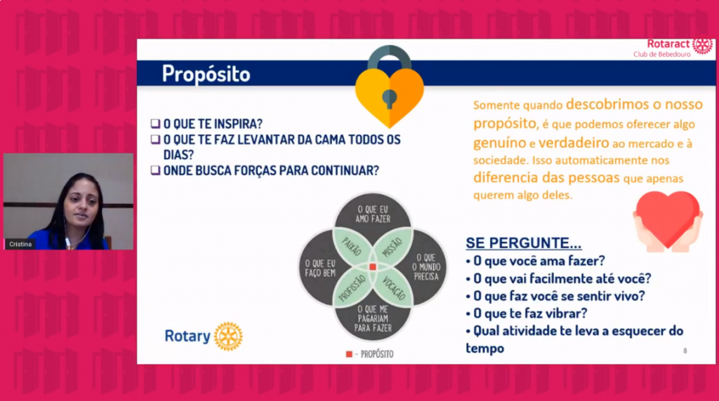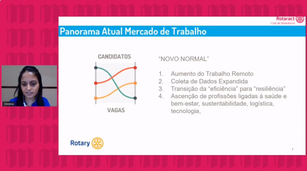 Nos dias 25 de julho e 22 de agosto, o Rotaract Club de Bebedouro realizou em seu canal no YouTube e página no Facebook duas transmissões ao vivo com foco na empregabilidade em tempos de pandemia. O projeto visou o desenvolvimento profissional de seus associados e da comunidade, visto que o cenário econômico mudou e que muitas pessoas estão desempregadas e perdidas com a nova realidade. A primeira live teve como facilitadora Cristina Buccironi de Melo, profissional em Business Partner na empresa Linx, onde a mesma focou nas mudanças na forma de recrutamento e seleção, com várias dicas de como concorrer as vagas. A segunda live teve como facilitadora a psicóloga Vivian Nacamura Massom, onde a mesma focou nas questões psicológicas nesse atual cenário e como lidar com isso no momento da candidatura a uma vaga.